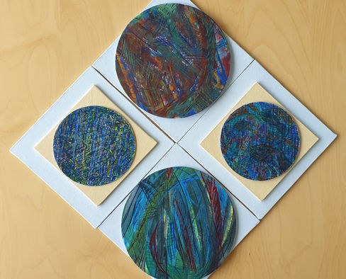 2) Continuer à composer les ronds, sur des carrés. Sur les ronds ci-dessous, remplacer pas mal de clair par du plus sombre (gris ? violet ?)